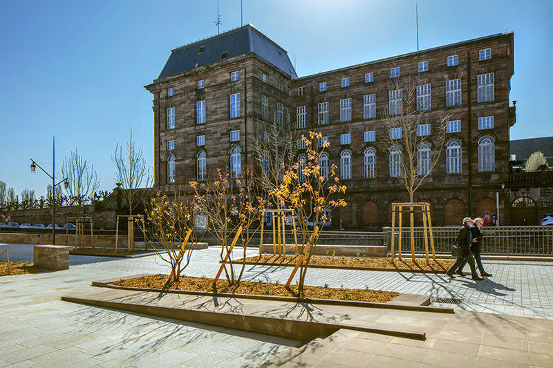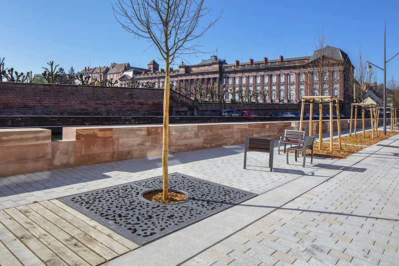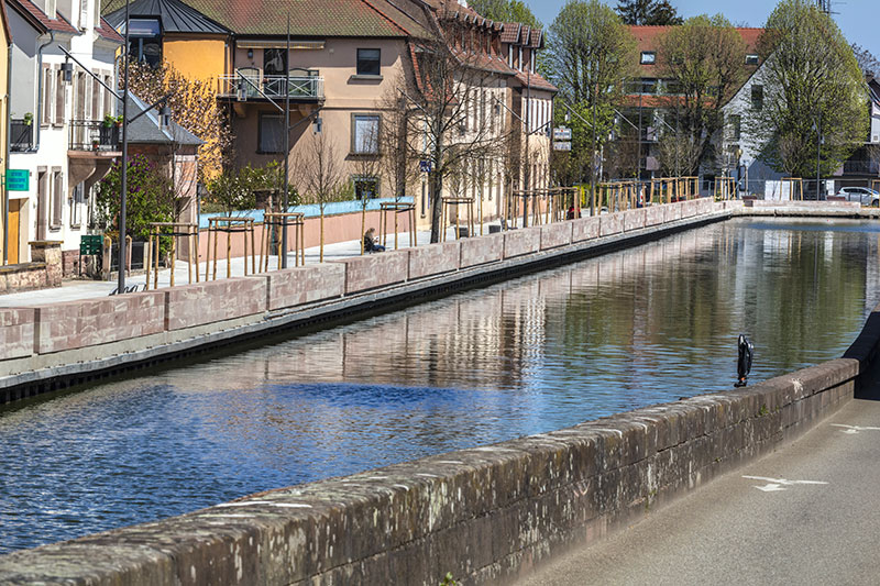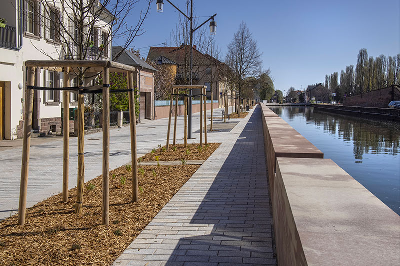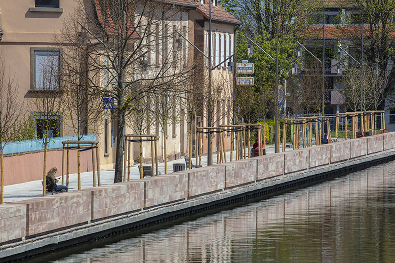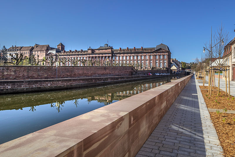 C’est dans le cadre de la requalification urbaine du Quai du Canal, boulevard urbain qui s’étend sur près de 400 m, que nos équipes ont pu mettre en avant leur savoir-faire et leur minutie dans le travail de la pierre naturelle locale : le grès des Vosges. Au cœur du patrimoine architectural remarquable de la ville de Saverne, le projet paysager veut redonner une place centrale au piéton, créer une zone de rencontre entre voitures, cyclistes et piétons, et redévelopper des usages liés à l’eau, par le biais de pontons surplombants le canal.