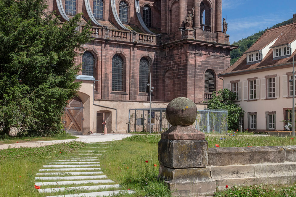 - Revêtements qualitatifs en béton bouchardé, sable stabilisé, marches et pavage en grès des Vosges, pavage en galets du Rhin éclatés