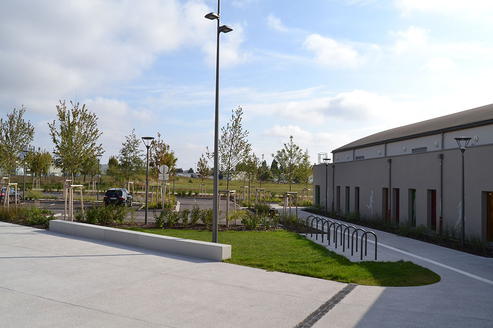 Bel exemple d’intégration paysagère d’un parking accueillant du public, l’aménagement du centre sportif Neuland à Rosheim est également une vitrine de notre savoir-faire en voirie qualitative. Un parvis de 3000 m² en béton désactivé accueille des banquettes courbes sur mesure en béton et du mobilier urbain.
